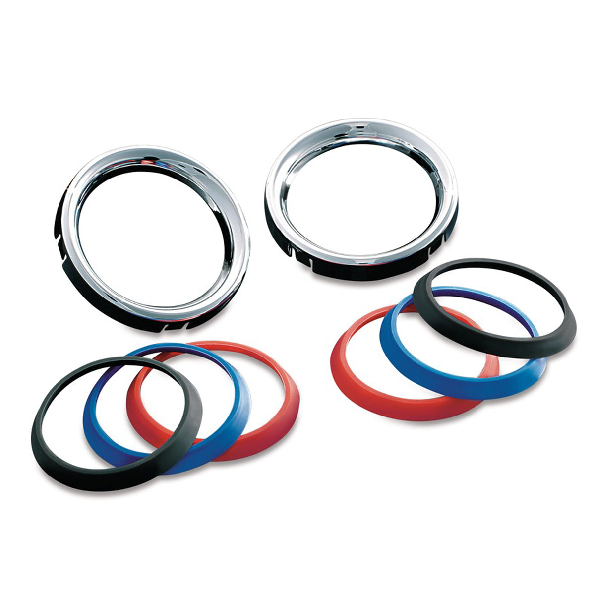 Estos elegantes biseles de calibre combinan hermosos anillos de cromo con elegantes detalles en color. El anillo de cromo presiona el acento de goma. Cada par de biseles incluye detalles en negro, rojo y azul, que brindan las opciones para el ciclista en el momento de la instalación para seleccionar el color que mejor complemente el esquema de pintura de su motocicleta.