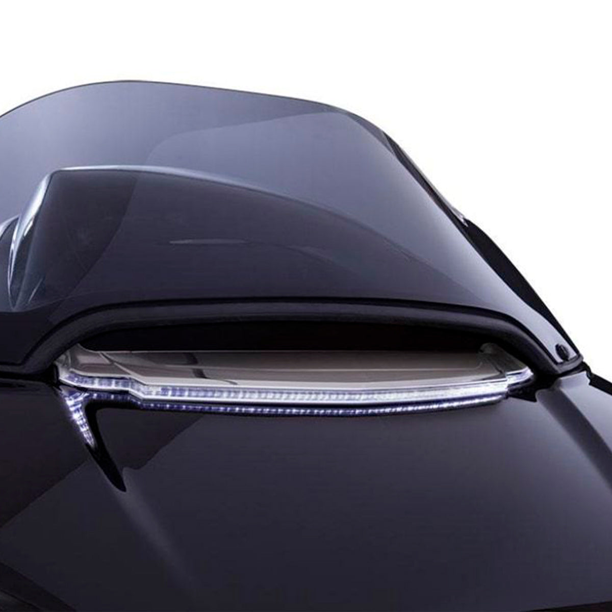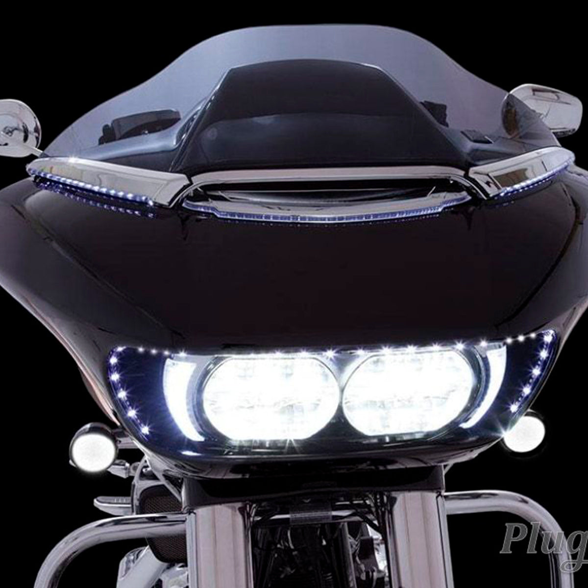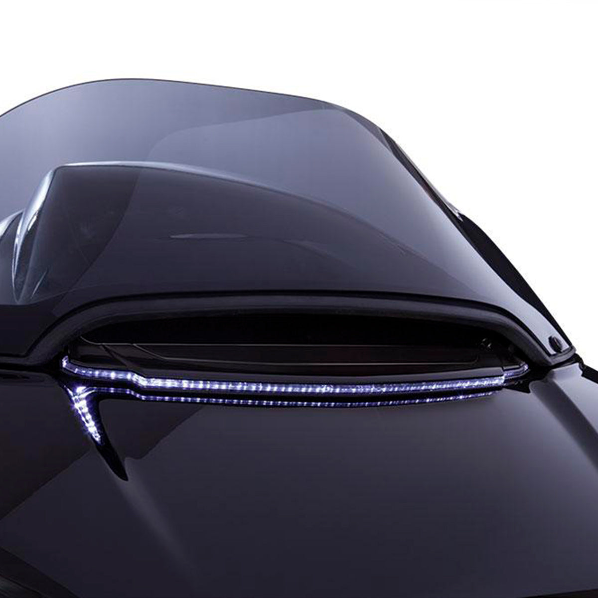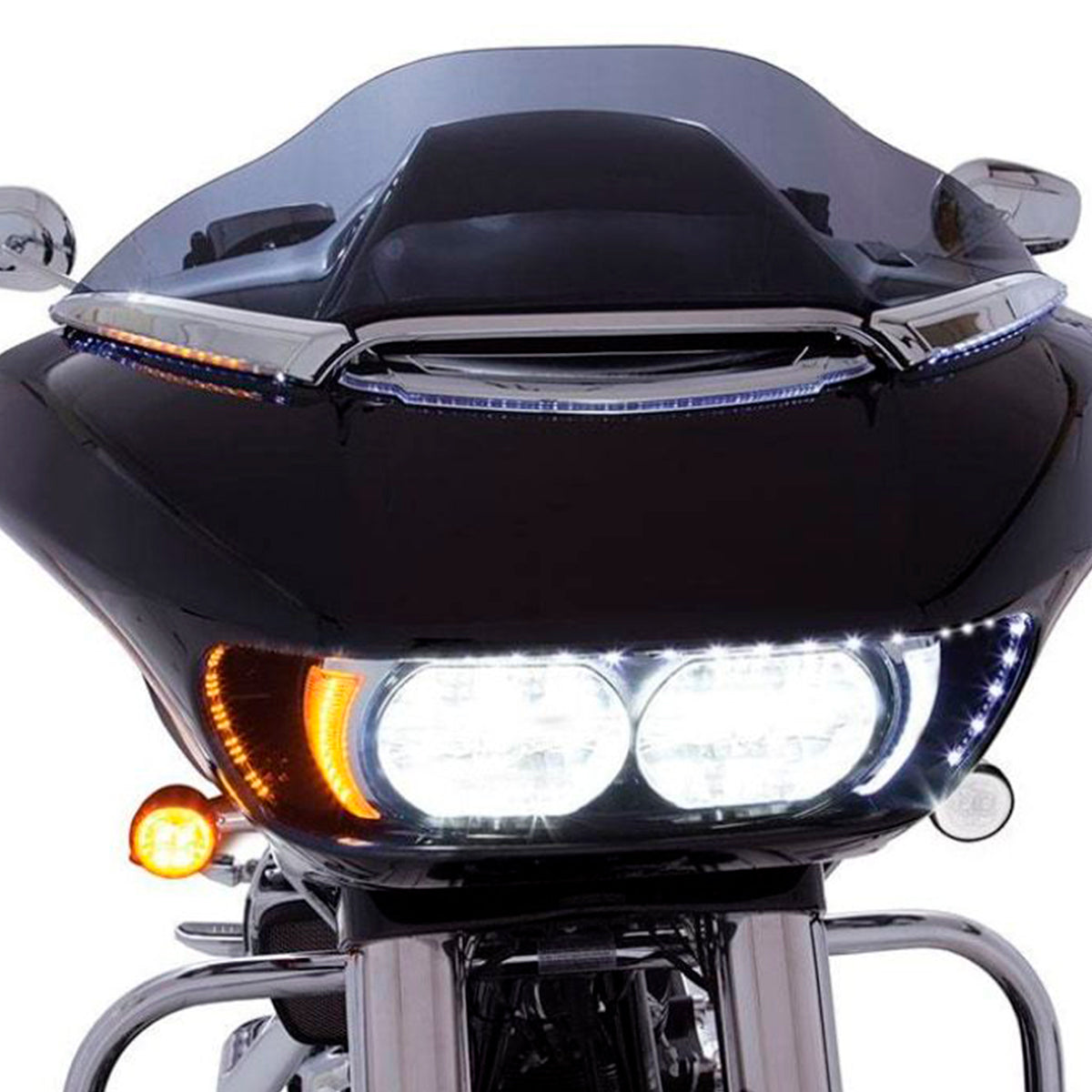 La moldura de ventilación iluminada Ciro cuenta con 30 LED blancos súper brillantes en una carcasa cromada o negra de bajo perfil para llamar realmente la atención sobre la parte delantera de su Road Glide. La carcasa tiene un diseño limpio que se asienta perfectamente en la ventilación de su carenado, pero no afectará el flujo de aire.