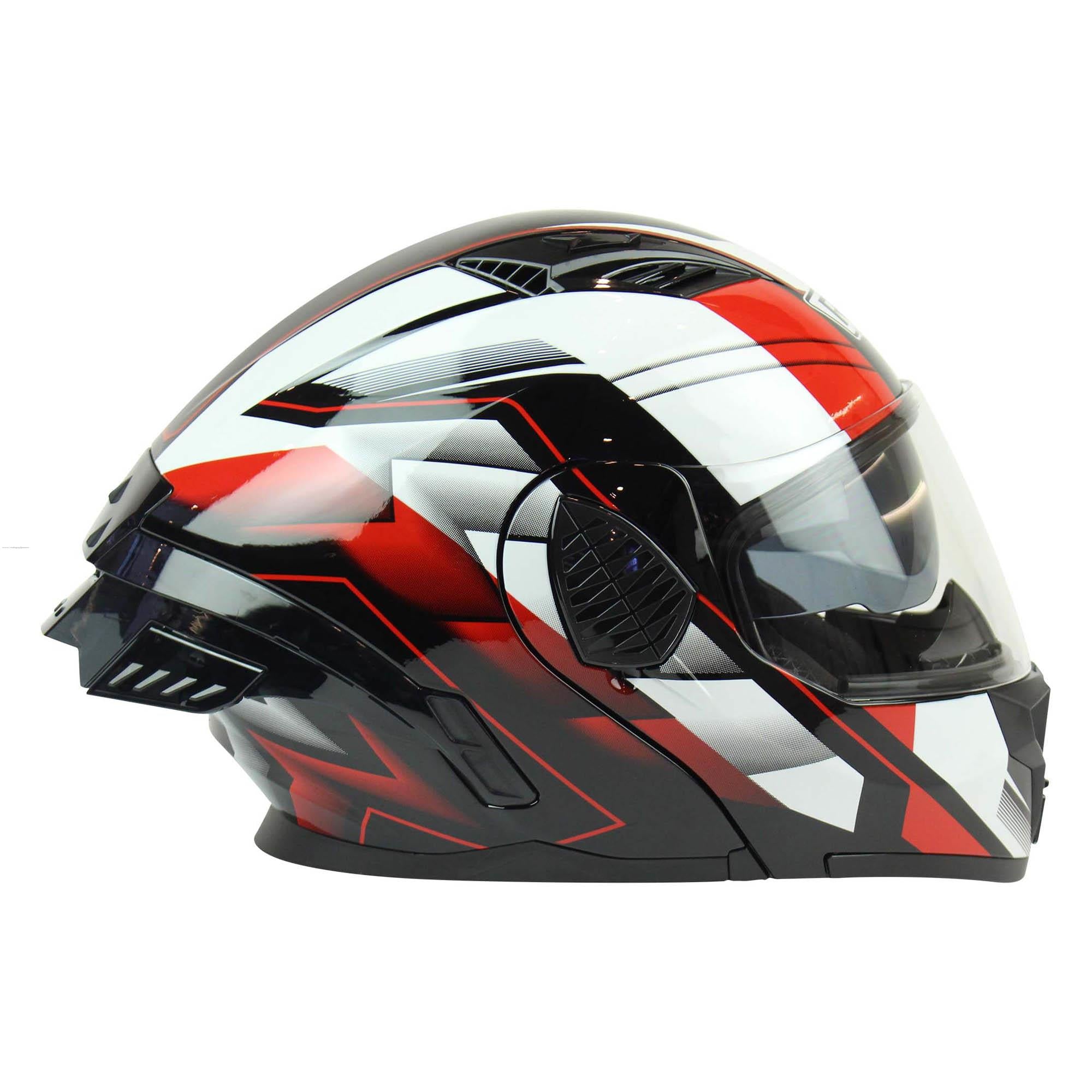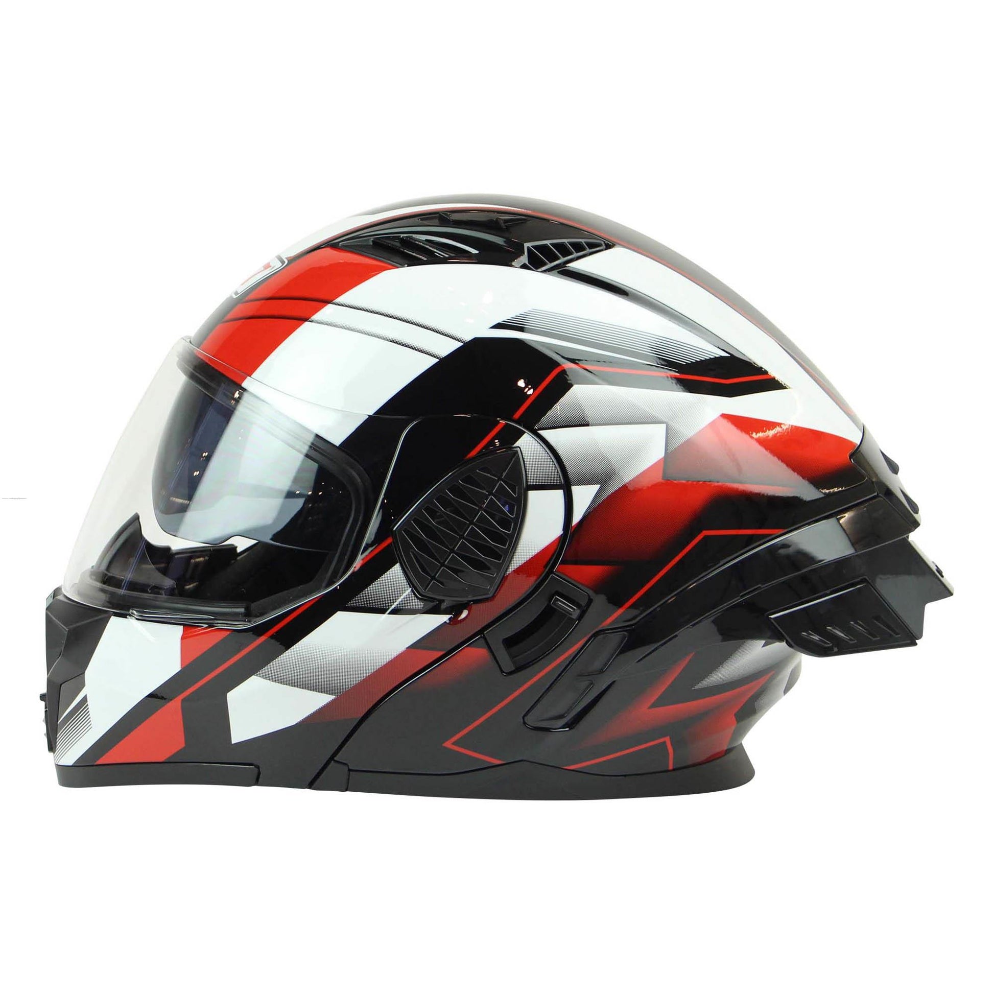 Este casco modular es una excelente opción para los motociclistas que buscan versatilidad práctica sin sacrificar un estilo puramente deportivo. Su mecanismo abatible te permite levantar la mentonera fácilmente para disfrutar de mayor frescura o comunicarte durante las paradas de tu ruta, mientras que al cerrarlo te ofrece la protección perimetral de un casco integral. Visualmente destaca por su silueta aerodinámica y un dinámico esquema de gráficos geométricos que combinan el rojo, el blanco y el negro. Además, al contar con certificación DOT, te asegura un alto estándar de absorción de impactos.