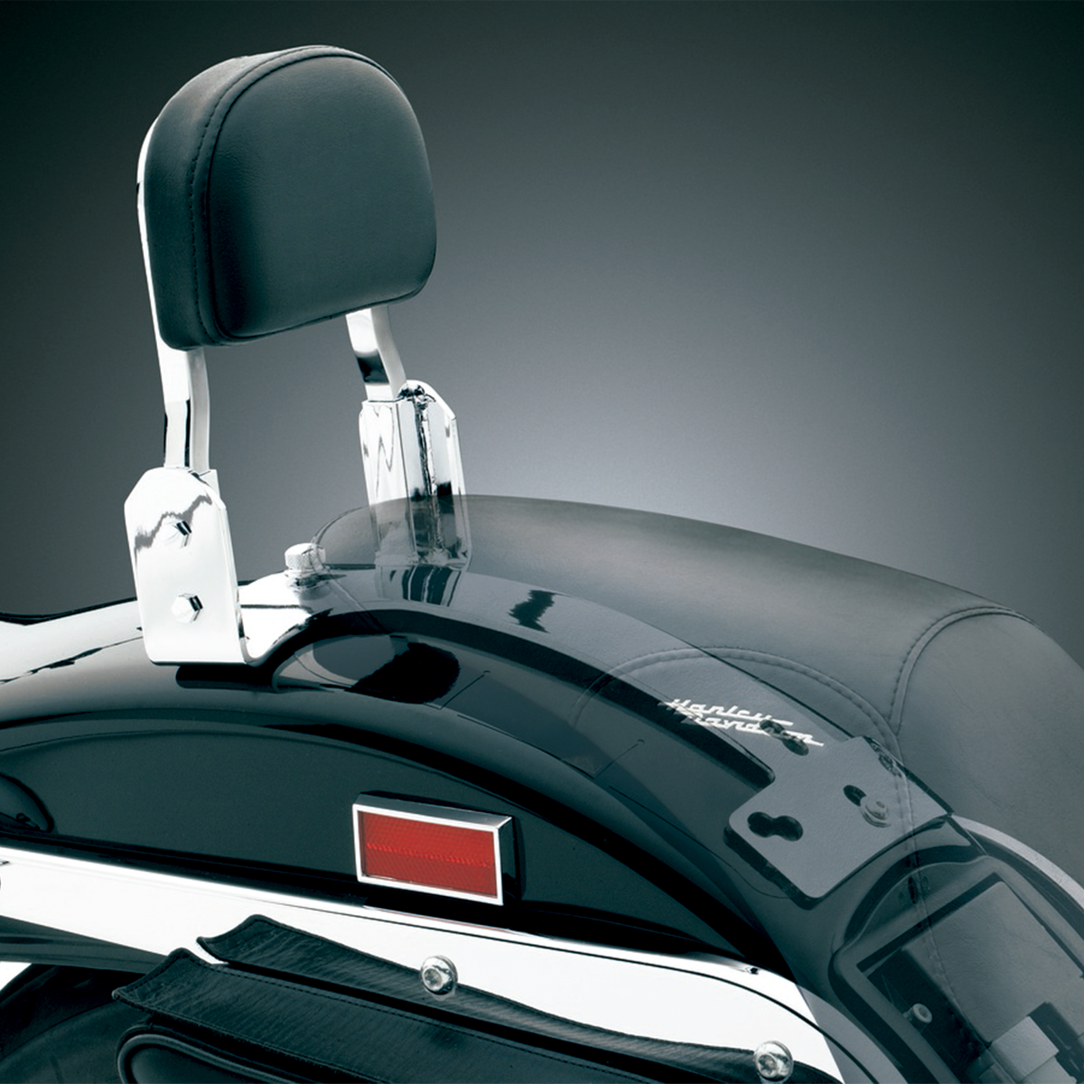 • Se atornilla al guardabarros trasero debajo del asiento del pasajero y acepta nuestra barra Sissy Bar baja y personalizada (P/N 8980) y almohadilla de respaldo (P/N 1605), ambas vendidas por separado, para mayor comodidad y conveniencia del pasajero. El respaldo y la almohadilla miden 6-1/2” de ancho x 9-1/2” de alto desde el guardabarros trasero.