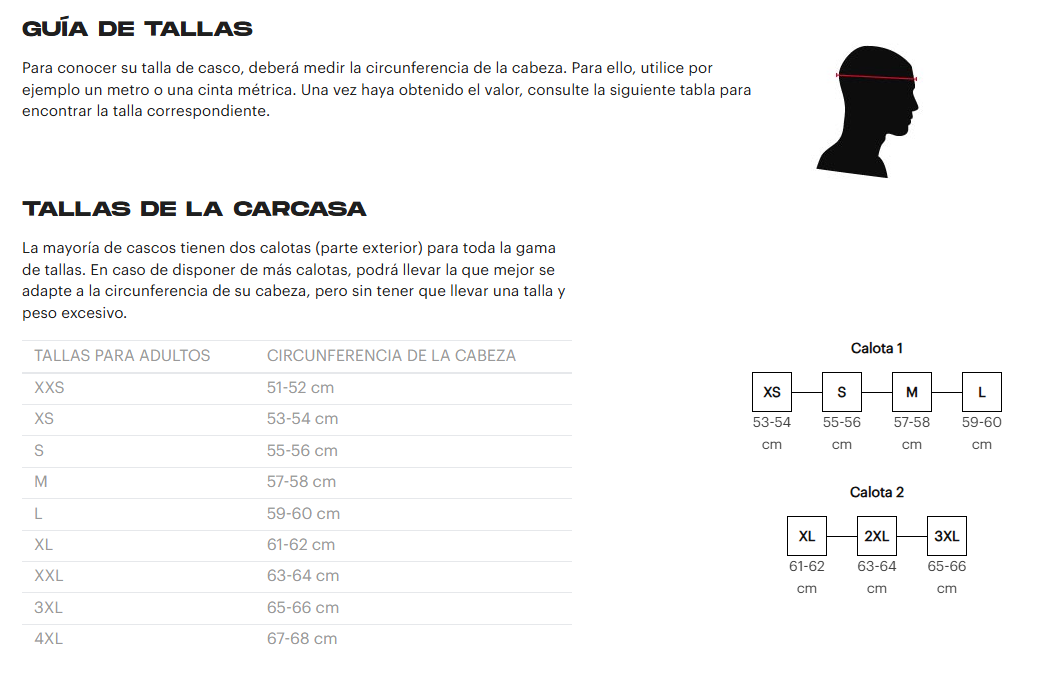 • Escoge la talla según la circunferencia craneal: XS‑S (53–56 cm), M‑L (57–62 cm), XL‑2XL (61–64 cm)