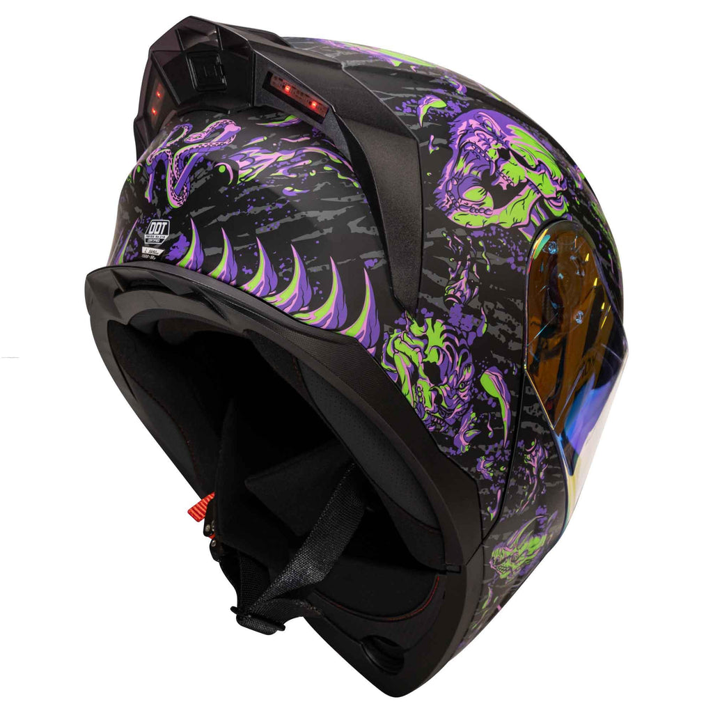 Este casco abatible cuenta con la homologación de seguridad DOT, esencial para rodar con confianza. Su mecanismo flip-up permite levantar la mentonera para mayor comodidad, ofreciendo así la funcionalidad de un casco jet cuando se requiere. La característica más sobresaliente es la iluminación LED integrada en la parte trasera, que proporciona un gran aumento en la visibilidad nocturna y bajo condiciones climáticas adversas.